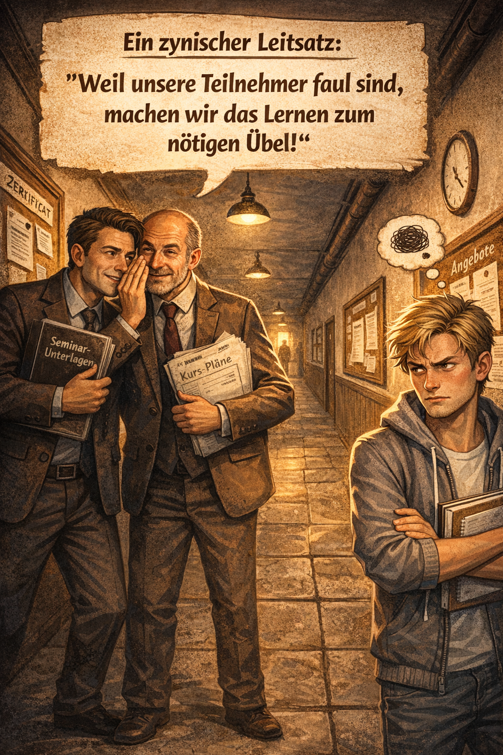 In den Fluren der Weiterbildungsbranche kursiert ein ungeschriebenes Gesetz, ein zynischer Leitsatz, der die Haltung vieler Anbieter auf den Punkt bringt. Er offenbart ein tiefes Misstrauen gegenüber dem eigenen Kunden – dem Teilnehmer.